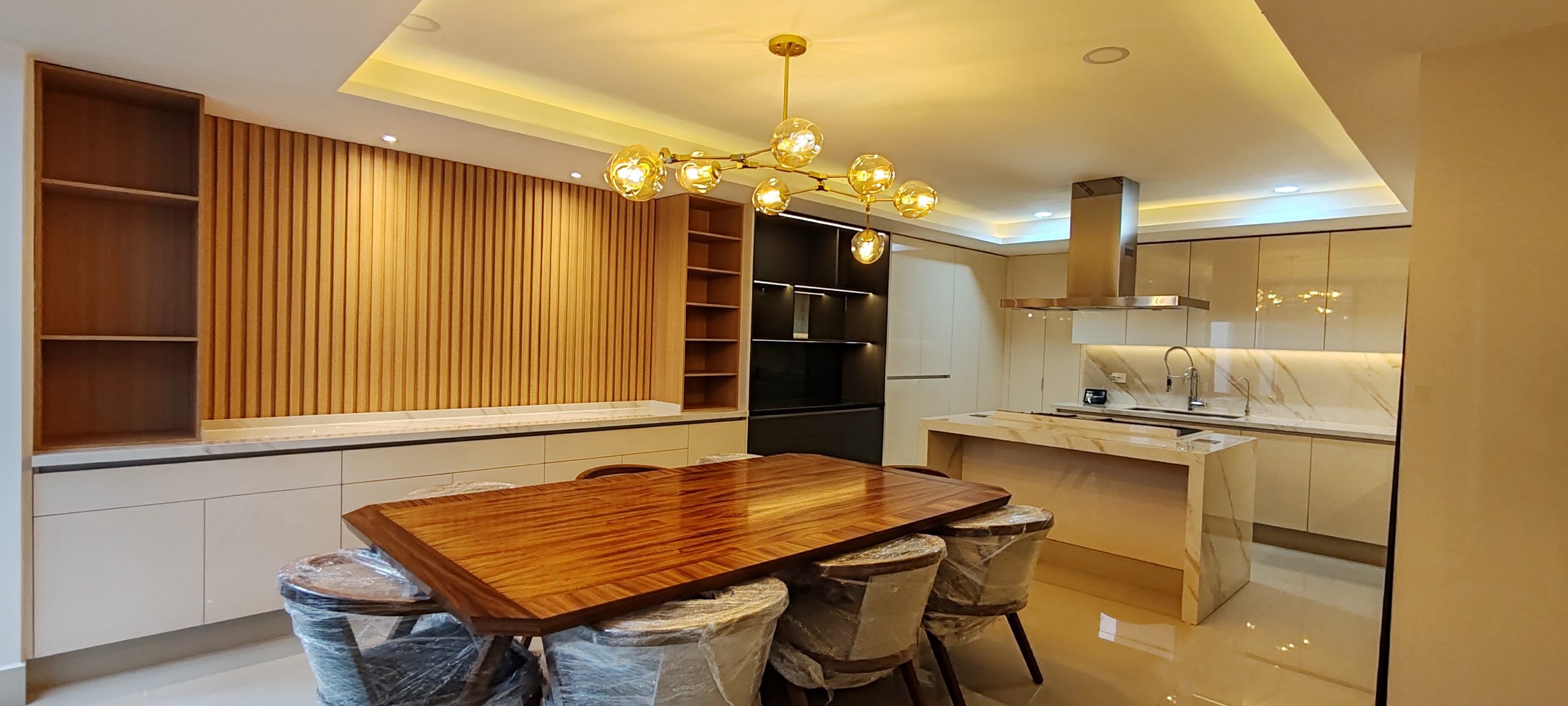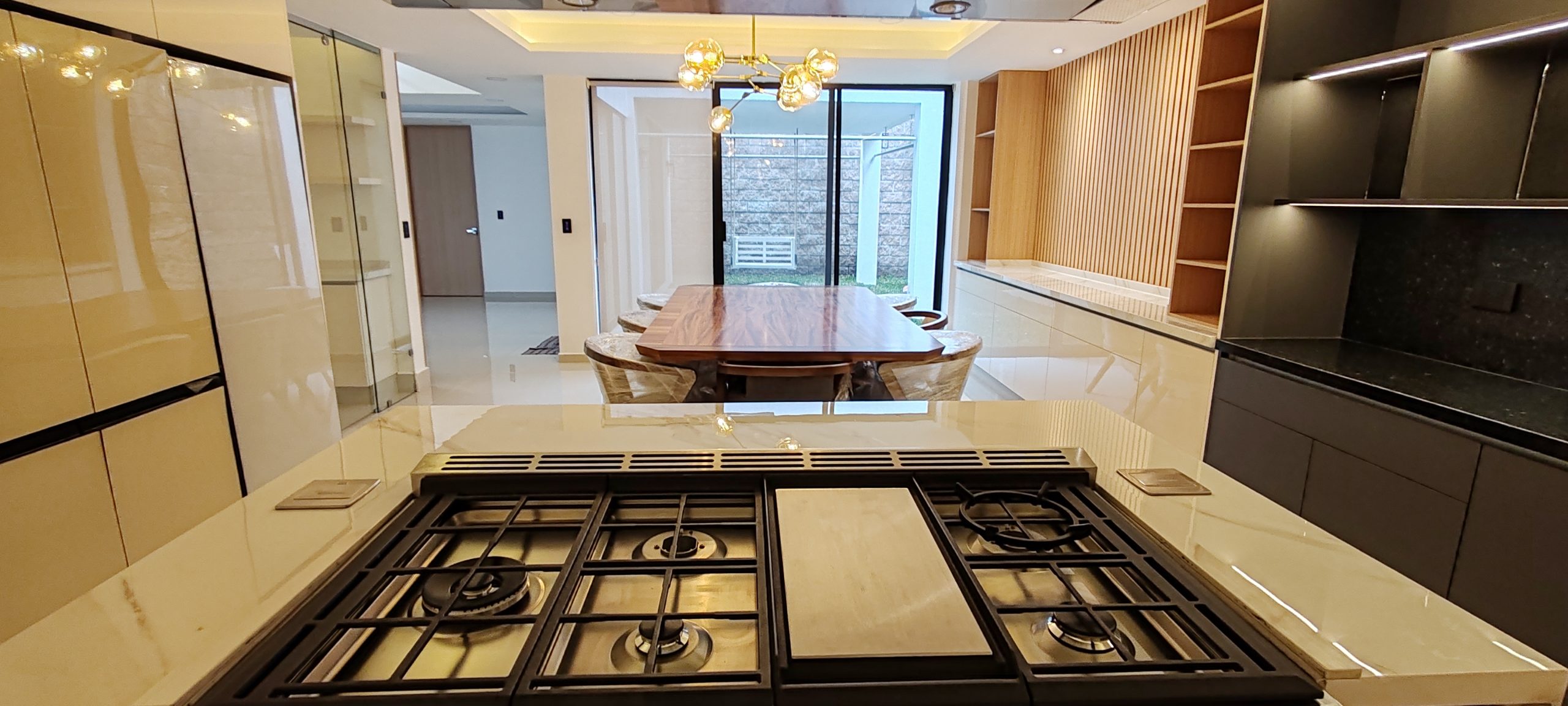 Una vez que entras te das cuenta del tamaño de la casa donde pusimos una cocina que es el punto focal y de reunión principal para la familia. Integramos cocina y comedor en un espacio muy acogedor con una isla y barra con piedra sinterizada importada, coffee station, alacenas, cuarto de fermentado, estantes y una alacena con cristal templado que decora el espacio. Es importante mencionar que la acción de cocinar es muy importante para esta familia ya que gustan de compartir esos momentos y disfrutar los alimentos en armonía y convivencia. Este espacio se integra con el comedor y una lámpara de diseño que combina perfectamente con los muebles y colores de la casa.
