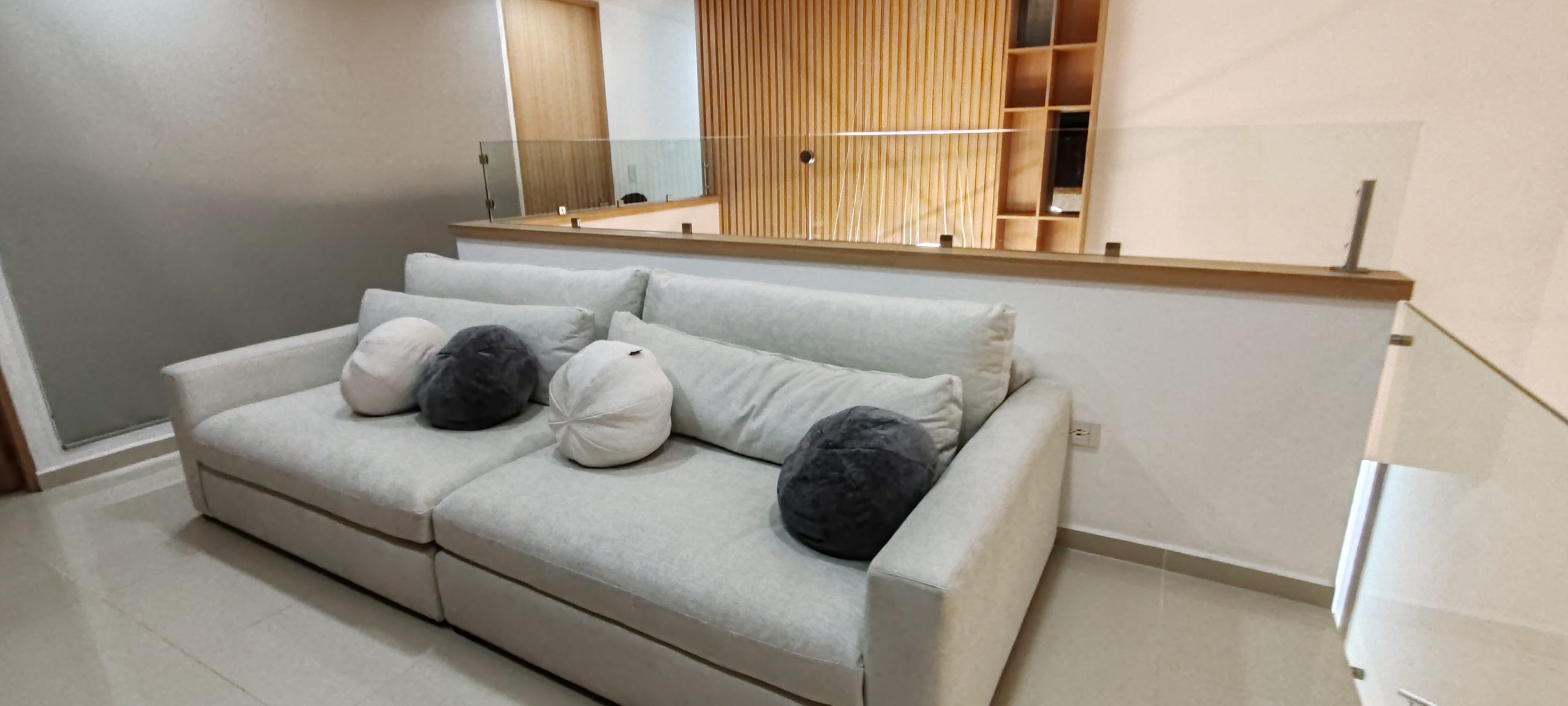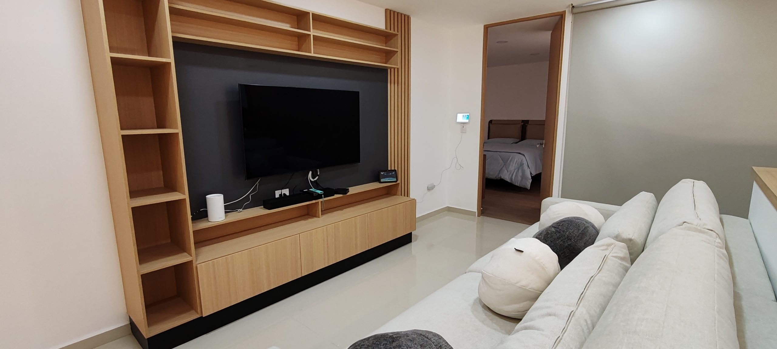 La sala es un punto de reunión y de distribución al mismo tiempo ya que nos recibe desde una puerta lateral, distribuye hacia la planta alta, jardín y comedor y es decorada con un mueble integrado de doble altura que va desde la planta baja a la planta alta y da una sensación de calidez no solo a la planta baja sino también a la sala de TV de la planta alta.